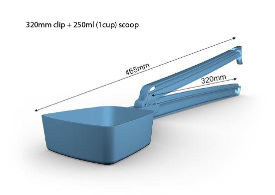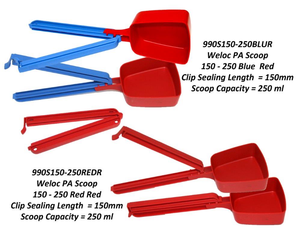 Items are specified by the clip measurement, followed by the scoop size; eg: 990S150-55 is a 150mm wide clip with a 55mm capacity scoop.